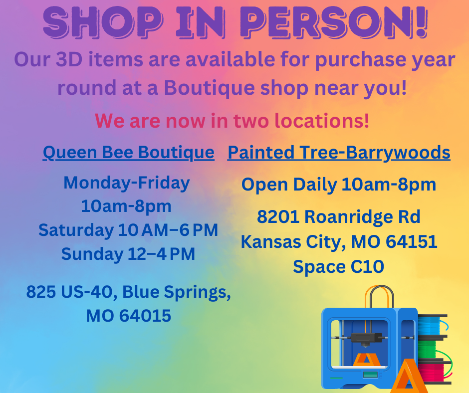 We are located in Queen Bee Boutique in Blue Springs. Our Space is near the main checkout.